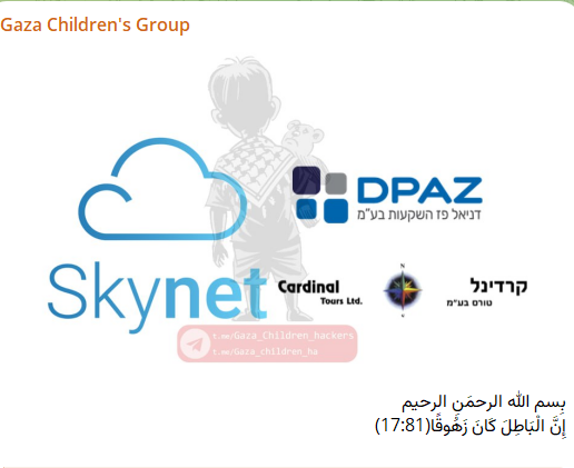 The Children of Gaza Hacker team claimed a cyberattack against several Israeli companies, naming Skynet Cloud Computing Ltd., Daniel Paz (DPaz), and Cardinal Tours.