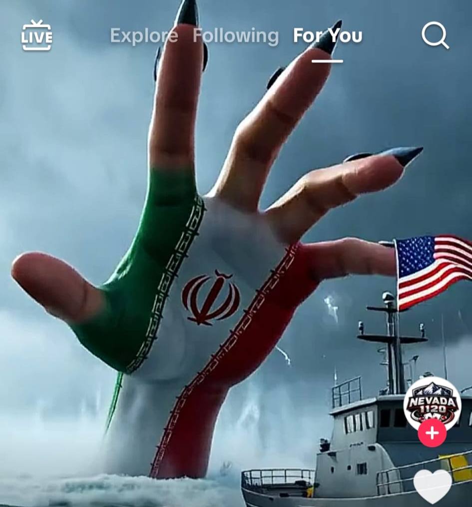 Example: An AI-generated video published on TikTok shows a giant hand in Iran’s flag colors rising from the sea toward a U.S. warship, using exaggerated scale and symbolism to project power, intimidation, and confrontation.