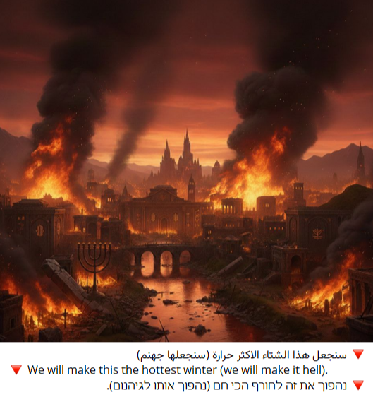 Example: An AI-generated propaganda image, shared on a pro-Iranian hacker group’s Telegram channel, depicts a burning city scene with a Jewish Menora. The image shows flames and widespread destruction, accompanied by threat messages in multiple languages, intended by pro-Iranian media and hacker networks to intensify intimidation and psychological warfare.